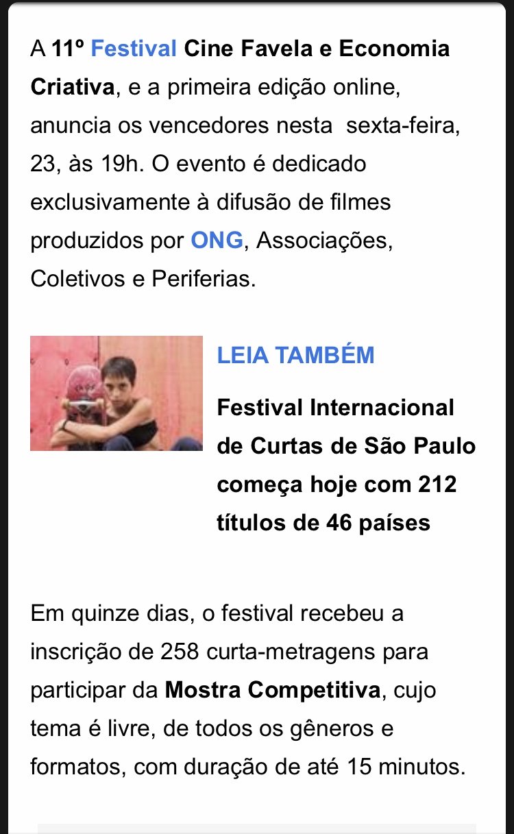 Com a chegada da Pandemia de Covid no Brasil, a 11a edição do Festival Cine Favela de Cinema foi realizada respeitando todos os protocolos de saúde.